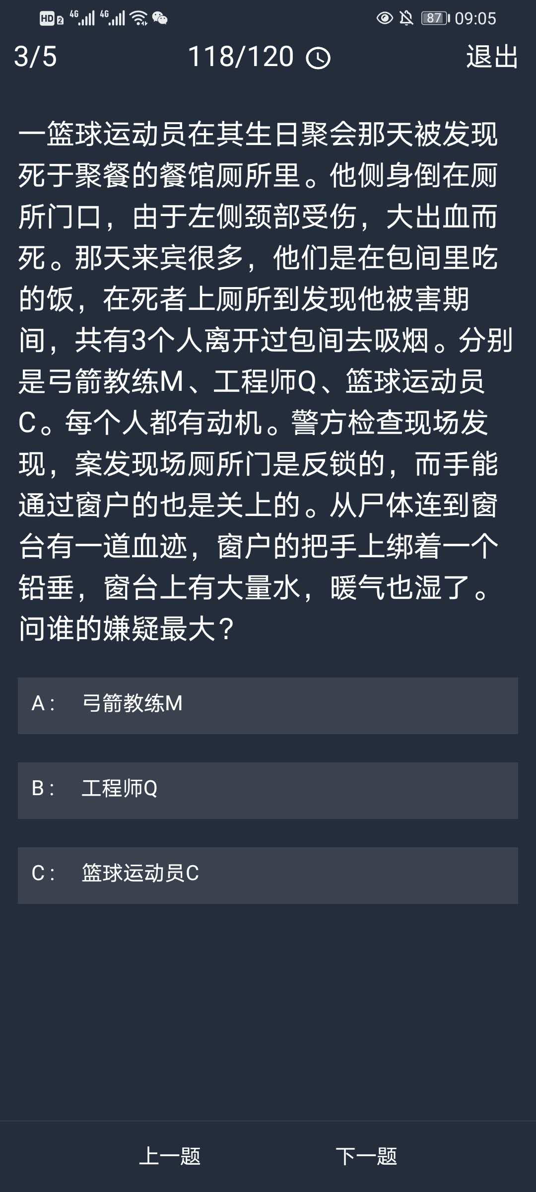3、一篮球运动员在其生日聚会那天被发现死于聚餐的餐馆厕所里。他侧身倒在厕所门口,由于左侧颈部受伤,大出血而死。那天来宾很多,他们是在包间里吃的饭,在死者上厕所到发现他被害期间,共有3个人离开过包间去吸烟。分别是弓箭教练M、工程师Q、篮球运动员C。每个人都有动机。警方检查现场发现,案发现场厕所门是反锁的,而手能通过窗户的也是关上的。从尸体连到窗台有一道血迹,窗户的把手上绑着一个铅垂,窗台上有大量水,暖气也湿了。问谁的嫌疑最大?