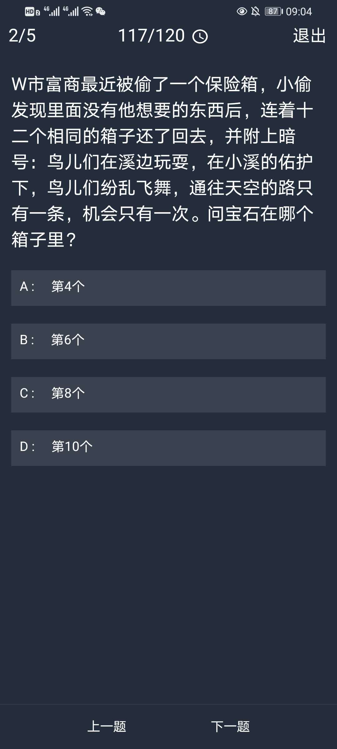 2、W市富商最近被偷了一个保险箱,小偷发现里面没有他想要的东西后,连着十二个相同的箱子还了回去,并附上暗号:鸟儿们在溪边玩耍,在小溪的佑护下,鸟儿们纷乱飞舞,通往天空的路只有一条,机会只有一次。问宝石在哪个箱子里?