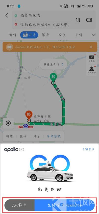目前只有两种方式可下单试乘百度自动驾驶出租车服务,分别是百度地图和Apollo GO App,下面以百度地图为例,Apollo GO软件的用户只需要打开app,选择上下车站点,选择乘车人数,选择立即呼叫Apollo GO即可。
