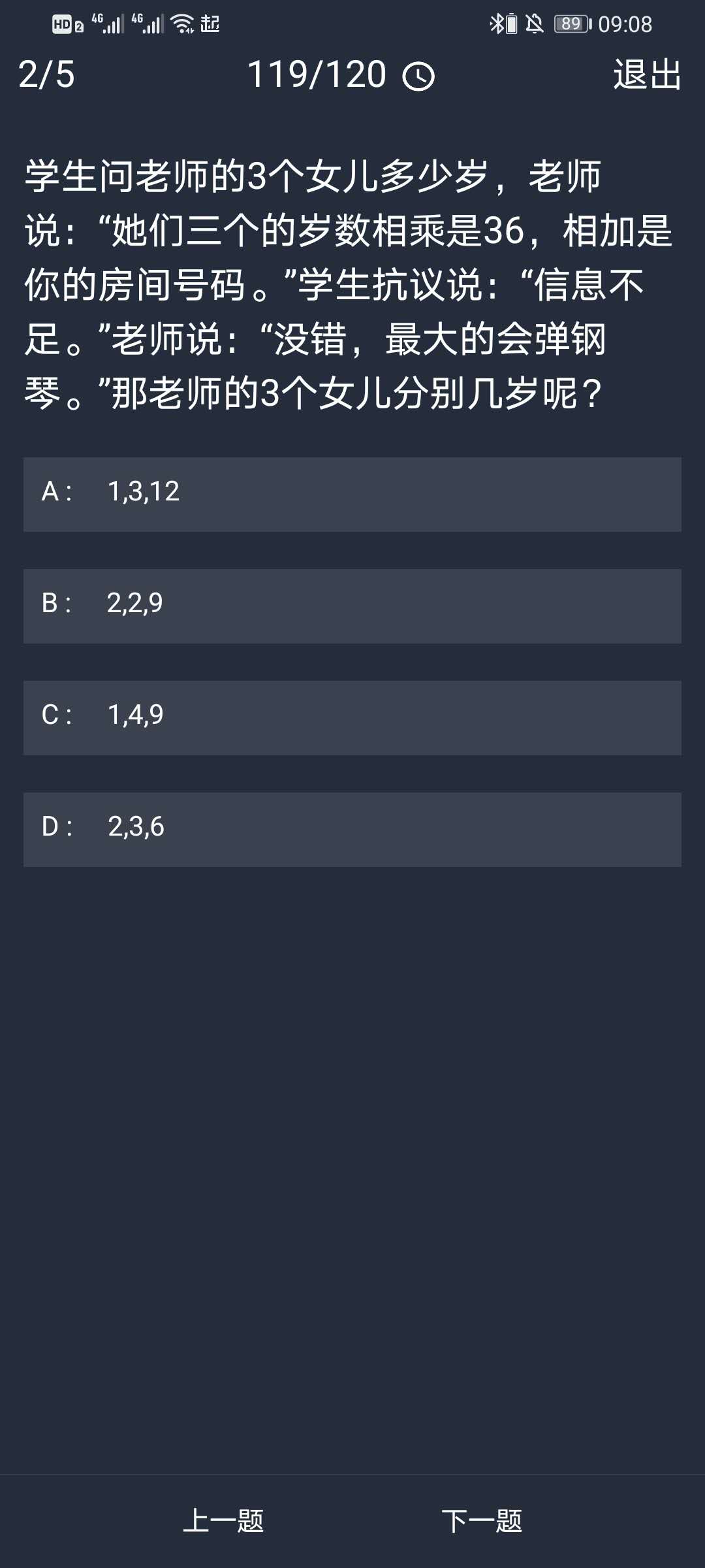 答案解析:积等于36,那么有1*1*36=36,1*2*18=36,1*3*12=36,1*4*9=36,1*6*6=36,2*2*9=36,2*3*6=36,3*3*4=36这几种情况。再来看相加1 1 36=38,1 2 18=21,1 3 12=16,1 4 9=14,1 6 6=13,2 2 9=13,2 3 6=11,3 3 4=10。如果学生的房间号是13号以外的数字,那么学生就能直接确定,不会说条件不足。所以学生的房间应是13号,而和为13的有两条,166,和229。最大的会弹钢琴,即只有一个会弹钢琴,那么就是2岁2岁9岁的组合。