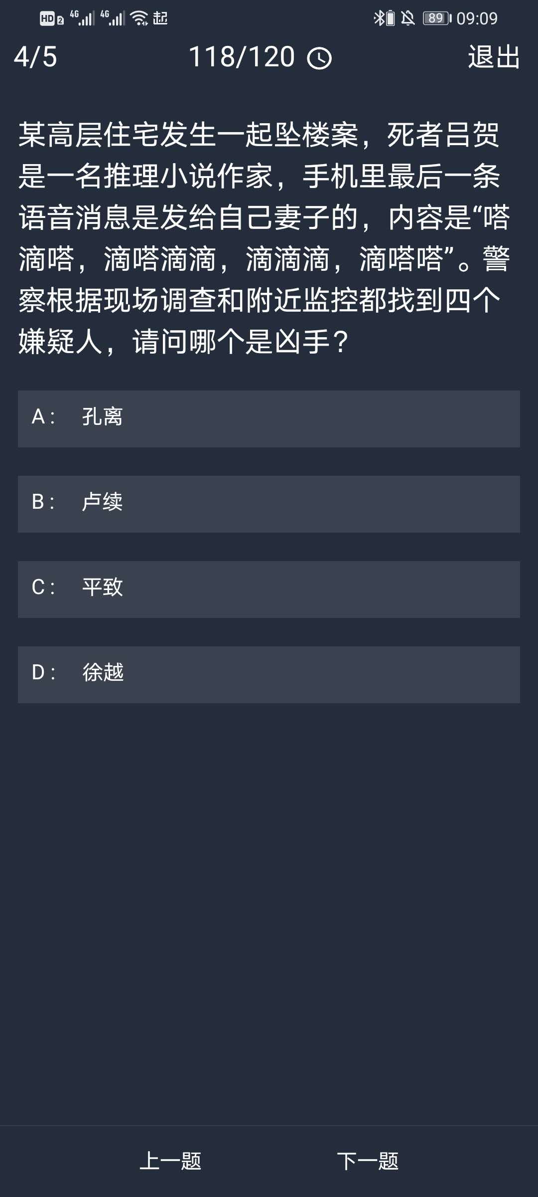4、某高层住宅发生一起坠楼案,死者吕贺是一名推理小说作家,手机里最后一条语音消息是发给自己妻子的,内容是“嗒滴嗒,滴嗒滴滴,滴滴滴,滴嗒嗒”。警察根据现场调查和附近监控都找到四个嫌疑人,请问哪个是凶手?