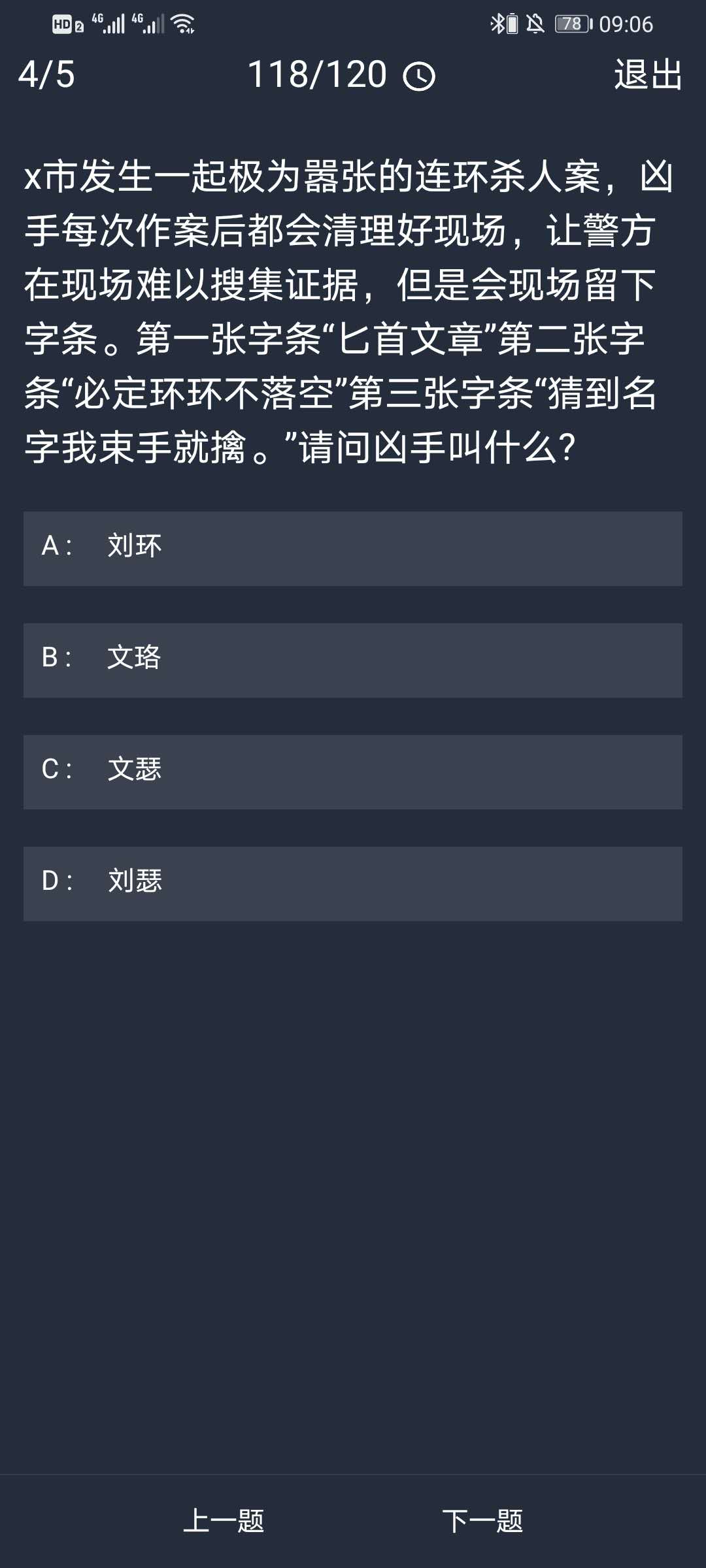 答案解析:匕首是””,文章取“文”,“文"和”"是“刘”;必定取“必”,“环环"不落空是“王王”,“王王“和“必”是“瑟”。所以凶手名字是刘瑟。
