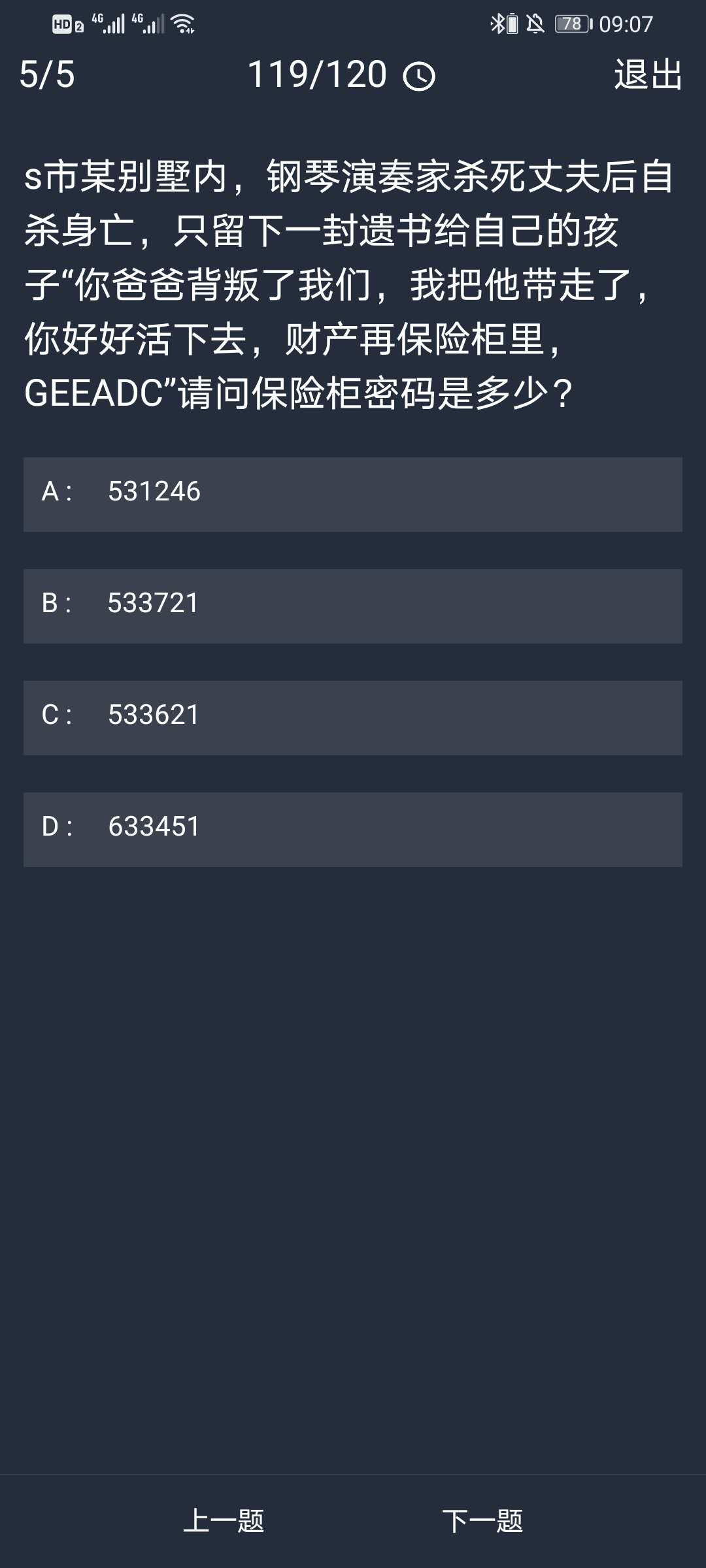 5、s市某别墅内,钢琴演奏家杀死丈夫后自杀身亡,只留下一封遗书给自己的孩子“你爸爸背叛了我们,我把他带走了,你好好活下去,财产再保险柜里,GEEADC"请问保险柜密码是多少?