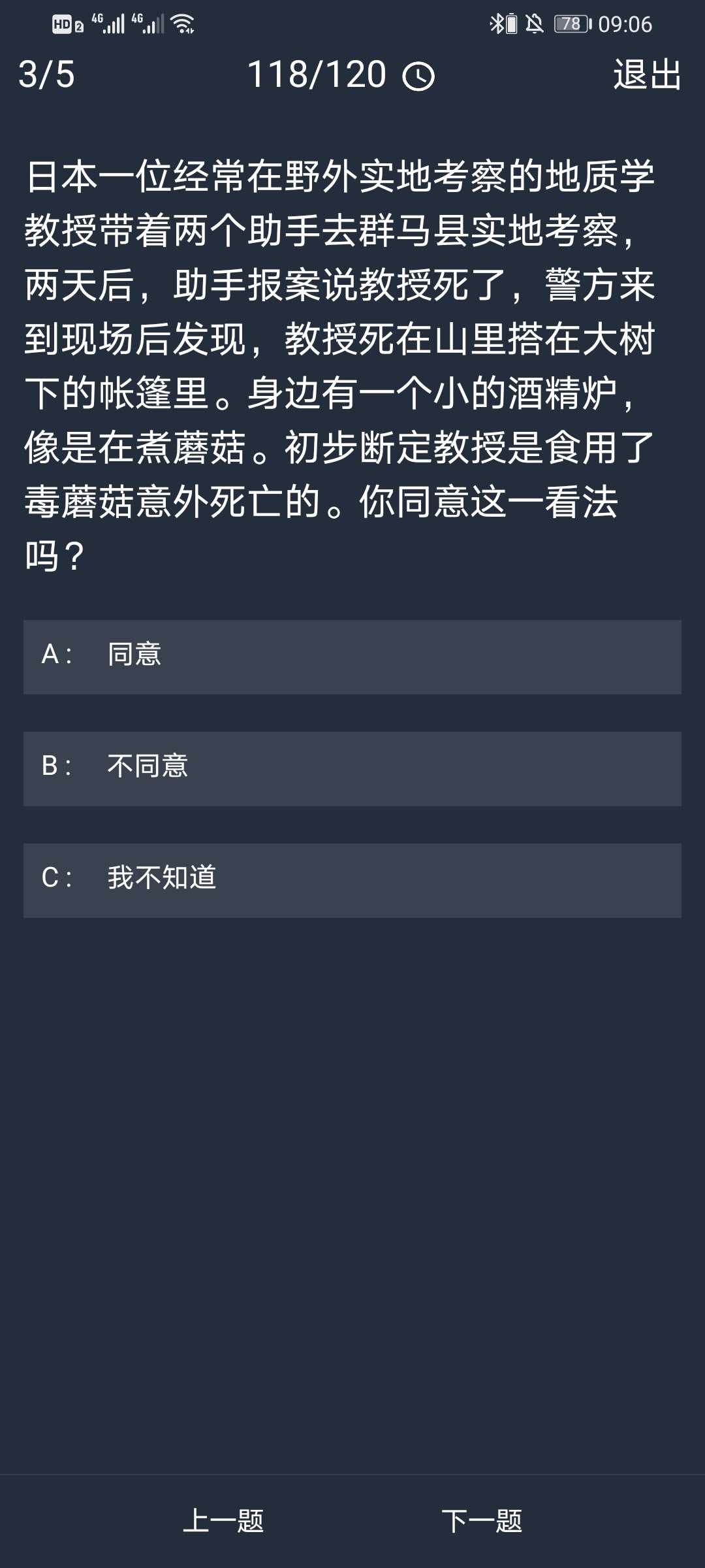 3、日本一位经常在野外实地考察的地质学教授带着两个助手去群马县实地考察,两天后,助手报案说教授死了,警方来到现场后发现,教授死在山里搭在大树下的帐篷里。身边有一个小的酒精炉,像是在煮蘑菇。初步断定教授是食用了毒蘑菇意外死亡的。你同意这一看法吗?