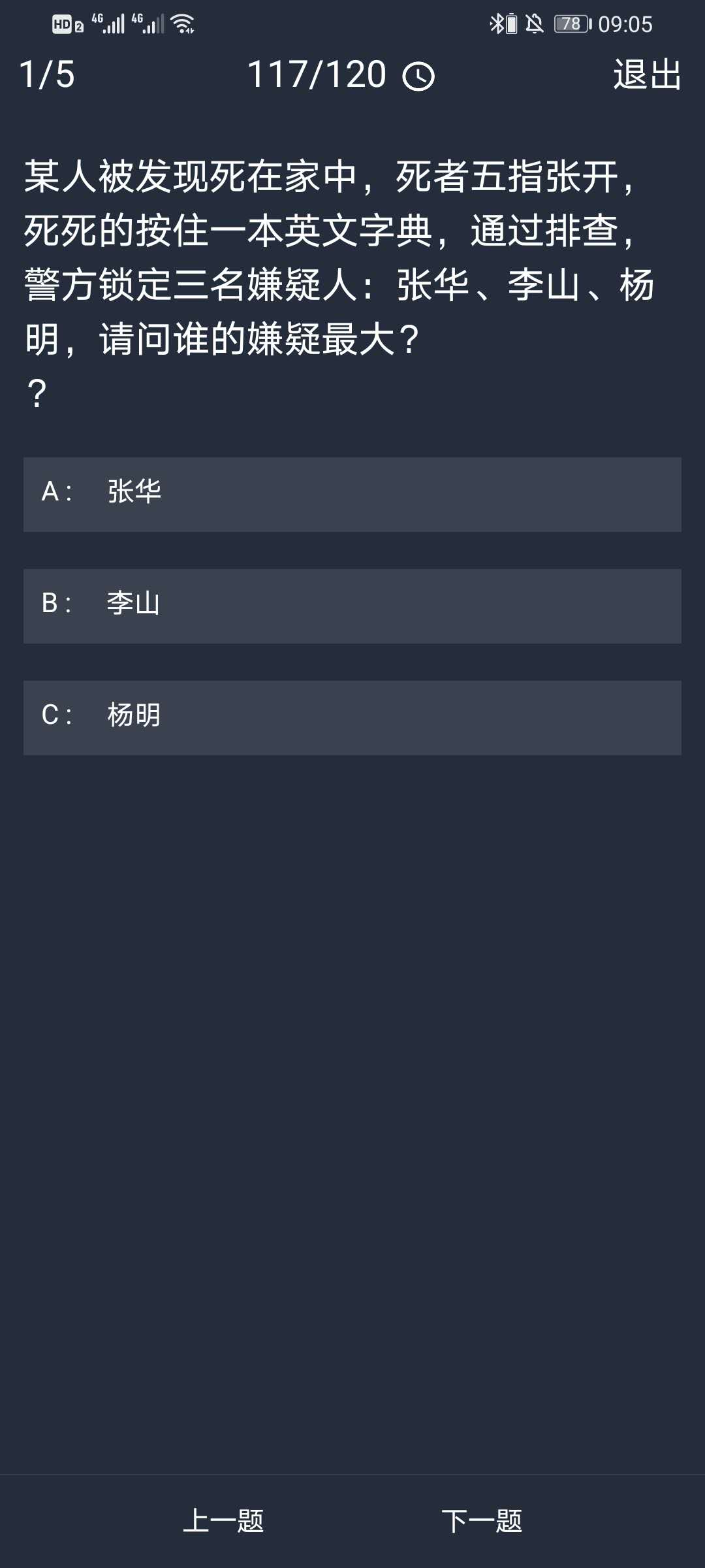 1、某人被发现死在家中,死者五指张开,死死的按住一本英文字典,通过排查,警方锁定三名嫌疑人:张华、李山、杨明,请问谁的嫌疑最大?