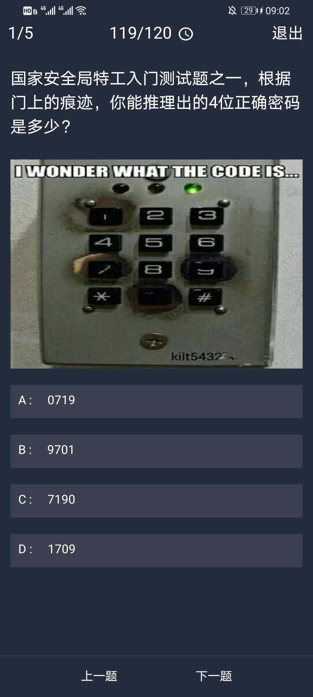 1、国家安全局特工入门测试题之一,根据门上的痕迹,你能推理出的4位正确密码是多少?