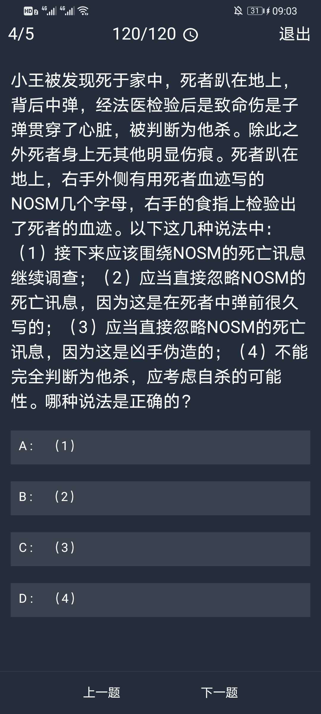 4、小王被发现死于家中,死者趴在地上,背后中弹,经法医检验后是致命伤是子弹贯穿了心脏,被判断为他杀。除此之外死者身上无其他明显伤痕。死者趴在地上,右手外侧有用死者血迹写的NOSM几个字母,右手的食指上检验出了死者的血迹。以下这几种说法中:(1)接下来应该围绕NOSM的死亡讯息继续调查;(2)应当直接忽略NOSM的死亡讯息,因为这是在死者中弹前很久写的;(3)应当直接忽略NOSM的死亡讯息,因为这是凶手伪造的;(4)不能完全判断为他杀,应考虑自杀的可能性。哪种说法是正确的?