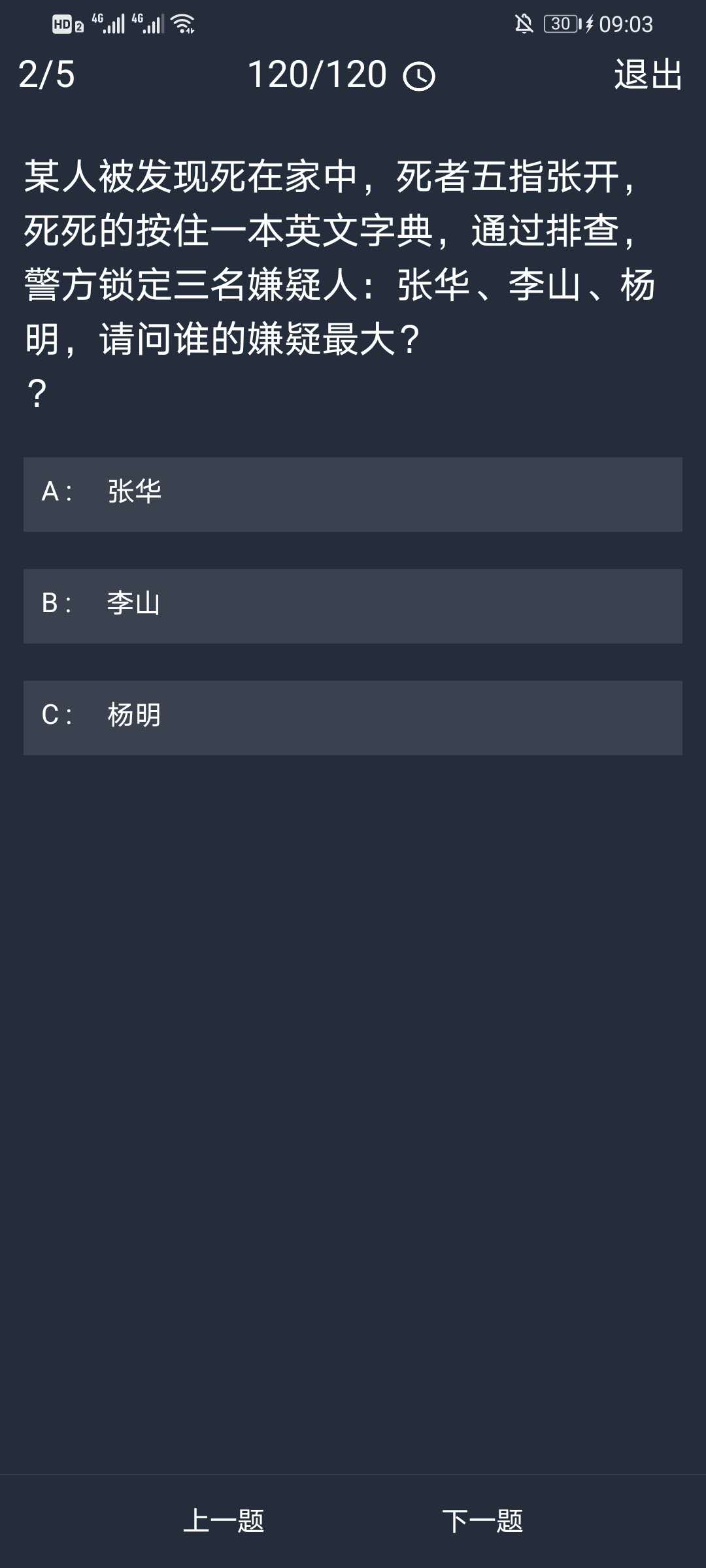 2、某人被发现死在家中,死者五指张开,死死的按住一本英文字典,通过排查,警方锁定三名嫌疑人:张华、李山、杨明,请问谁的嫌疑最大??