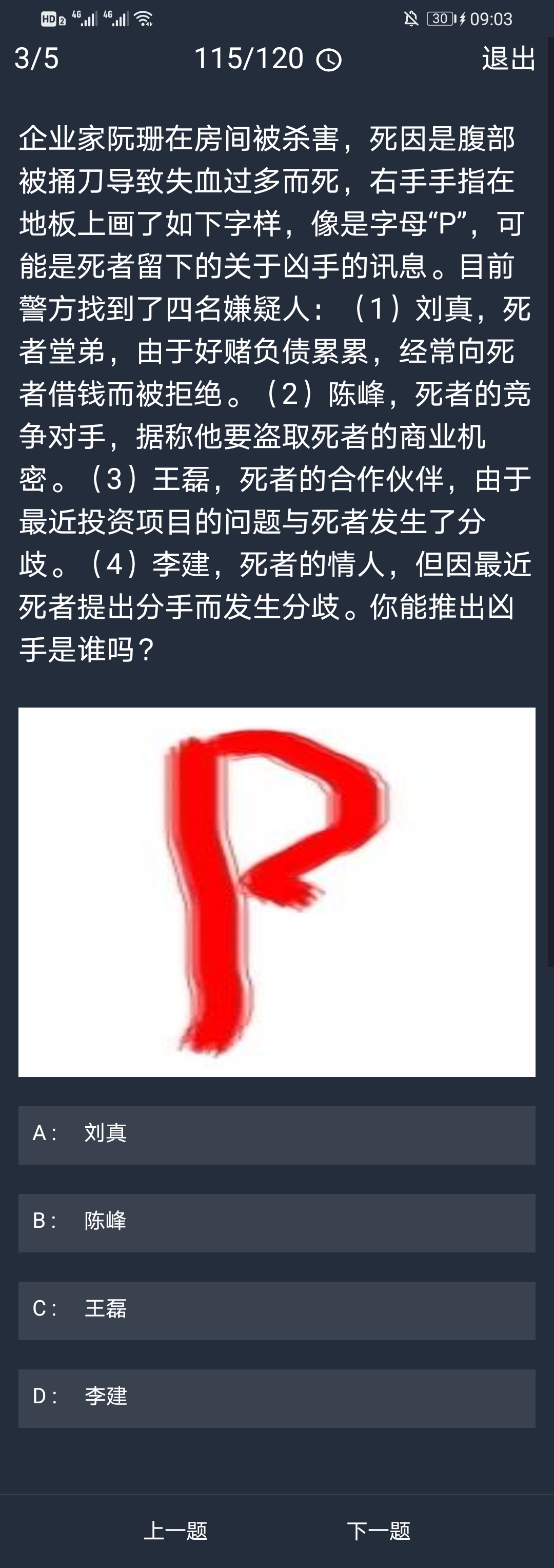 3、企业家阮珊在房间被杀害,死因是腹部被捅刀导致失血过多而死,右手手指在地板上画了如下字样,像是字母"P”,可能是死者留下的关于凶手的讯息。目前警方找到了四名嫌疑人:(1)刘真,死者堂弟,由于好赌负债累累,经常向死者借钱而被拒绝。(2)陈峰,死者的竞争对手,据称他要盗取死者的商业机密。(3)王磊,死者的合作伙伴,由于最近投资项目的问题与死者发生了分歧。(4)李建,死者的情人,但因最近死者提出分手而发生分歧。你能推出凶手是谁吗?