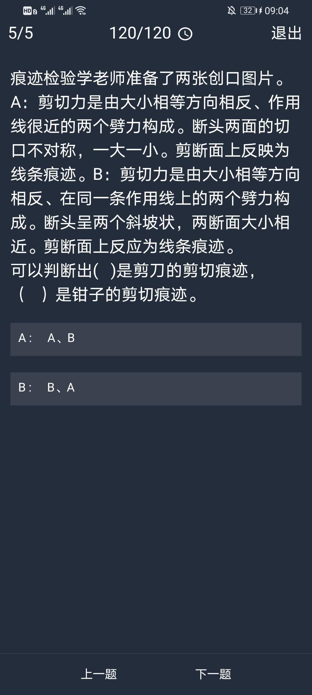5、痕迹检验学老师准备了两张创口图片。A:剪切力是由大小相等方向相反、作用线很近的两个劈力构成。断头两面的切口不对称,一大一小。剪断面上反映为线条痕迹。B:剪切力是由大小相等方向相反、在同一条作用线上的两个劈力构成。断头呈两个斜坡状,两断面大小相近。剪断面上反应为线条痕迹。可以判断出()是剪刀的剪切痕迹,()是钳子的剪切痕迹。