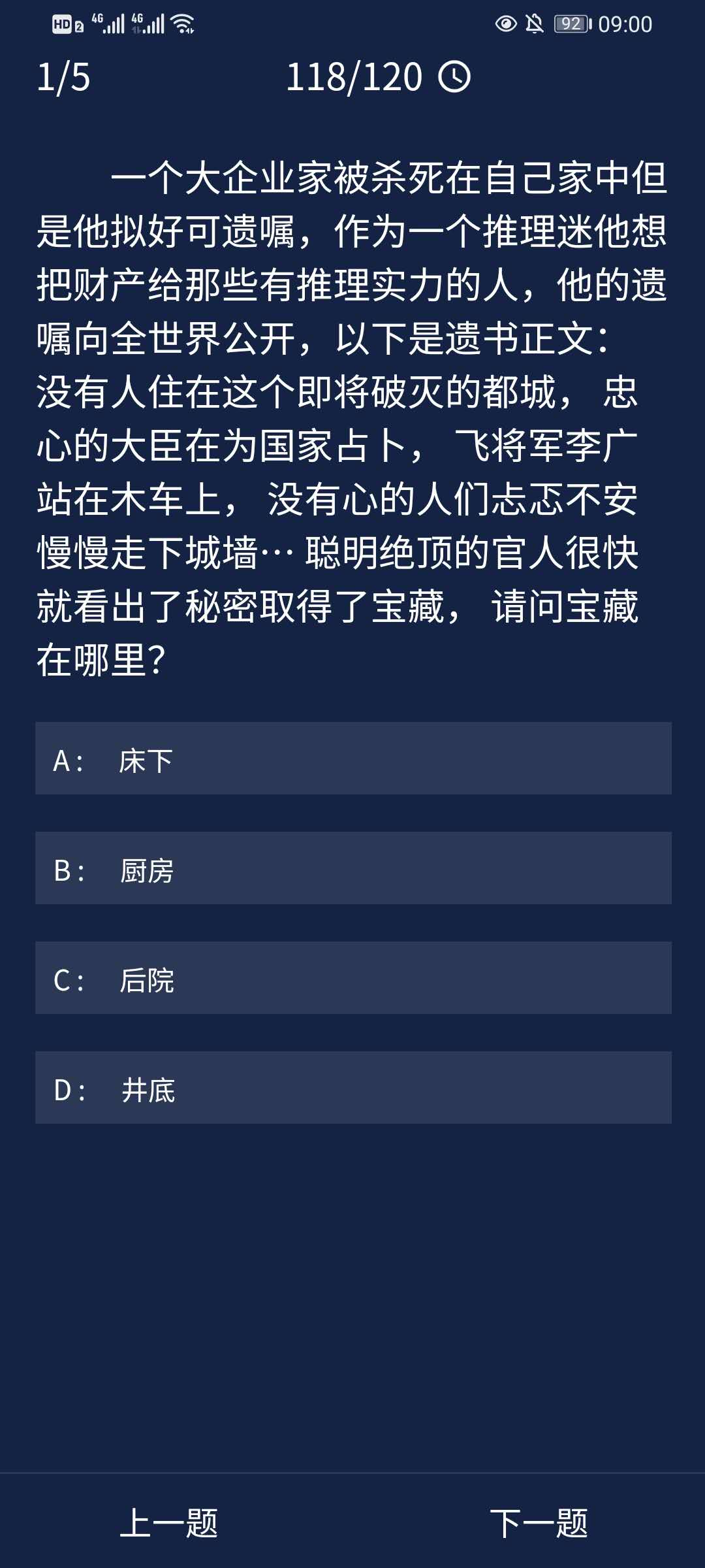 1、一个大企业家被杀死在自己家中但是他拟好可遗嘱,作为一个推理迷他想把财产给那些有推理实力的人,他的遗嘱向全世界公开,以下是遗书正文:没有人住在这个即将破灭的都城,忠心的大臣在为国家占卜,飞将军李广站在木车上,没有心的人们忐忑不安慢慢走下城墙…聪明绝顶的官人很快就看出了秘密取得了宝藏,请问宝藏在哪里?
