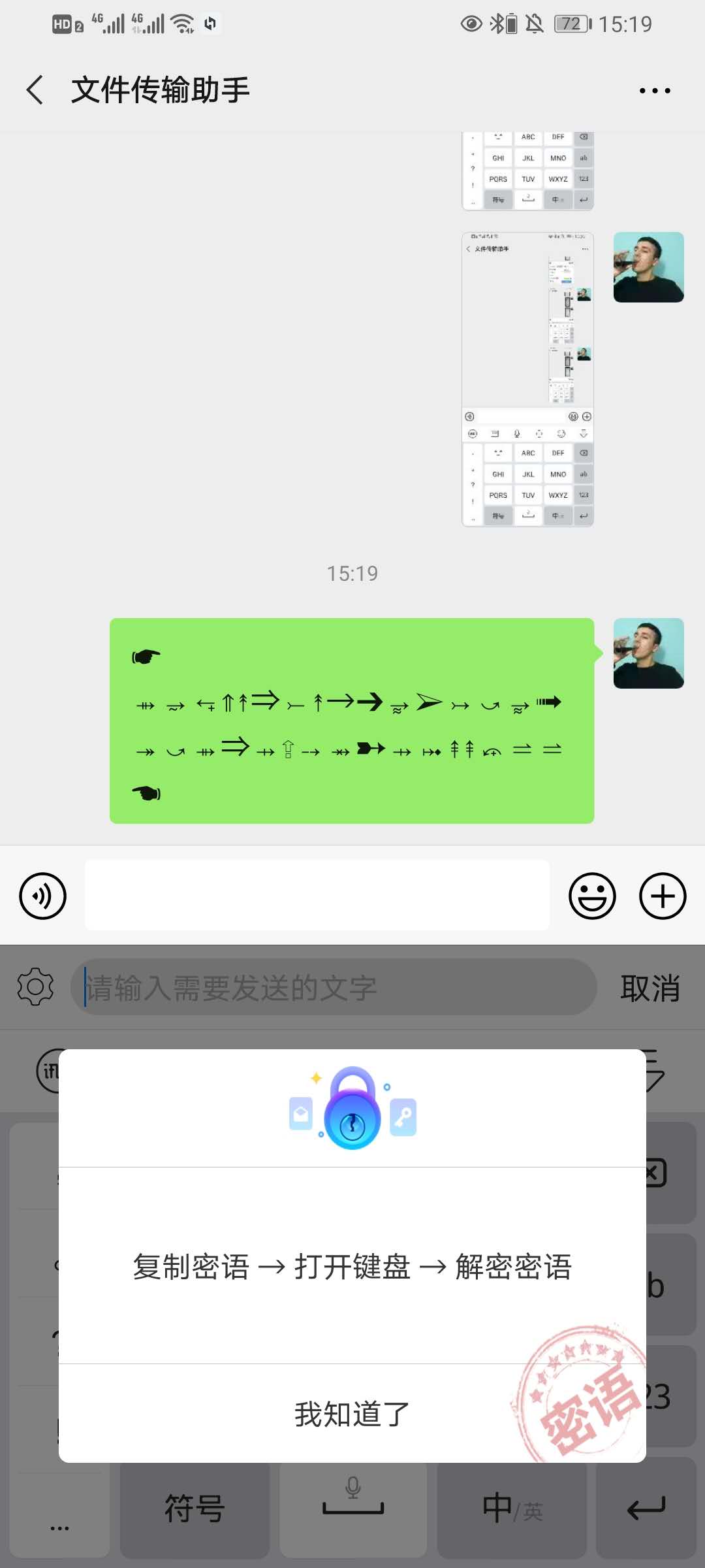 3、复制好密语后,我们只需要再次点击输入框,打开输入框讯飞输入法即可自动帮助我们进行解密(密语模式必须打开)。