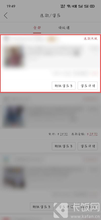 5、点击【售后关闭(详情)】,进入查看失败原因,以及再次申请退货退款;