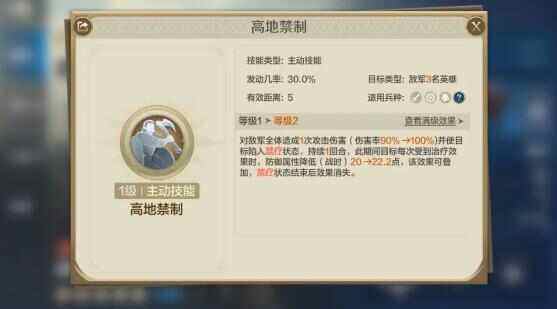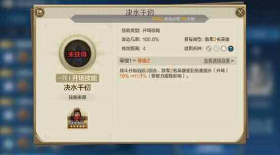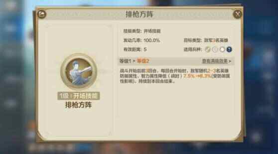 专属技能【排枪方阵】:战斗开始后前3回合,每回合开始时,敌军随机2-3名英雄防御属性、智力属性降低(战时)7.5%→8.3%(受防御属性影响),持续到本回合结束。