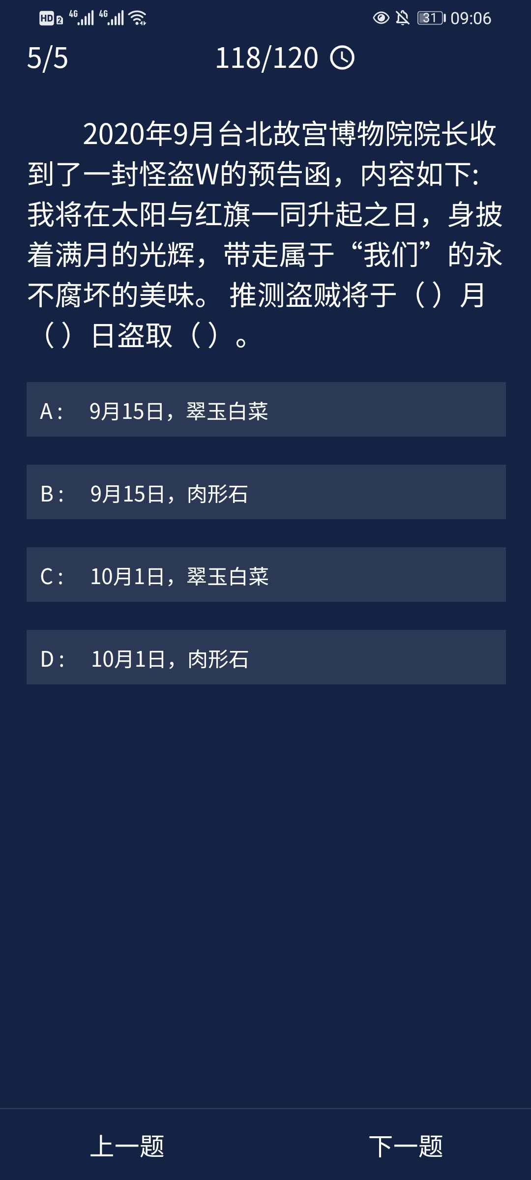 5、2020年9月台北故宫博物院院长收到了一封怪盗W的预告函,内容如下:我将在太阳与红旗一同升起之日,身披着满月的光辉,带走属于“我们”的永不腐坏的美味。推测盗贼将于()月()日盗取()。