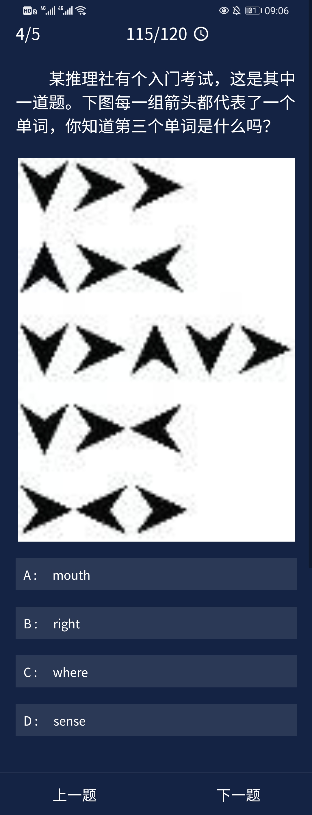 4、某推理社有个入门考试,这是其中一道题。下图每一组箭头都代表了一个单词,你知道第三个单词是什么吗?