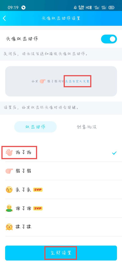 6、然后进入头像双击动作设置,选择双击动作为【拍了拍】,然后点击上方的【点击自定义文案】即可;