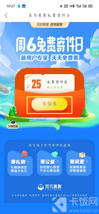 3、随后在周6免费寄件日活动,点击【去领券】按钮;