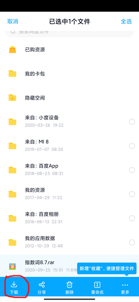 2.在网盘文件中找到找到自己需要下载的压缩包,长按压缩包;