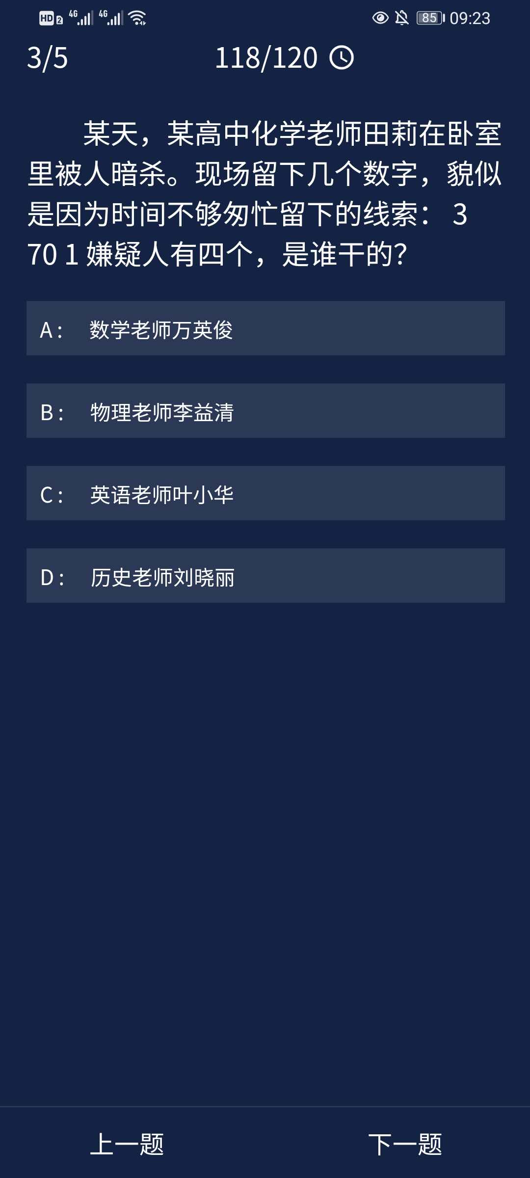 3、某天,某高中化学老师田莉在卧室里被人暗杀。现场留下几个数字,貌似是因为时间不够匆忙留下的线索:3701嫌疑人有四个,是谁干的?