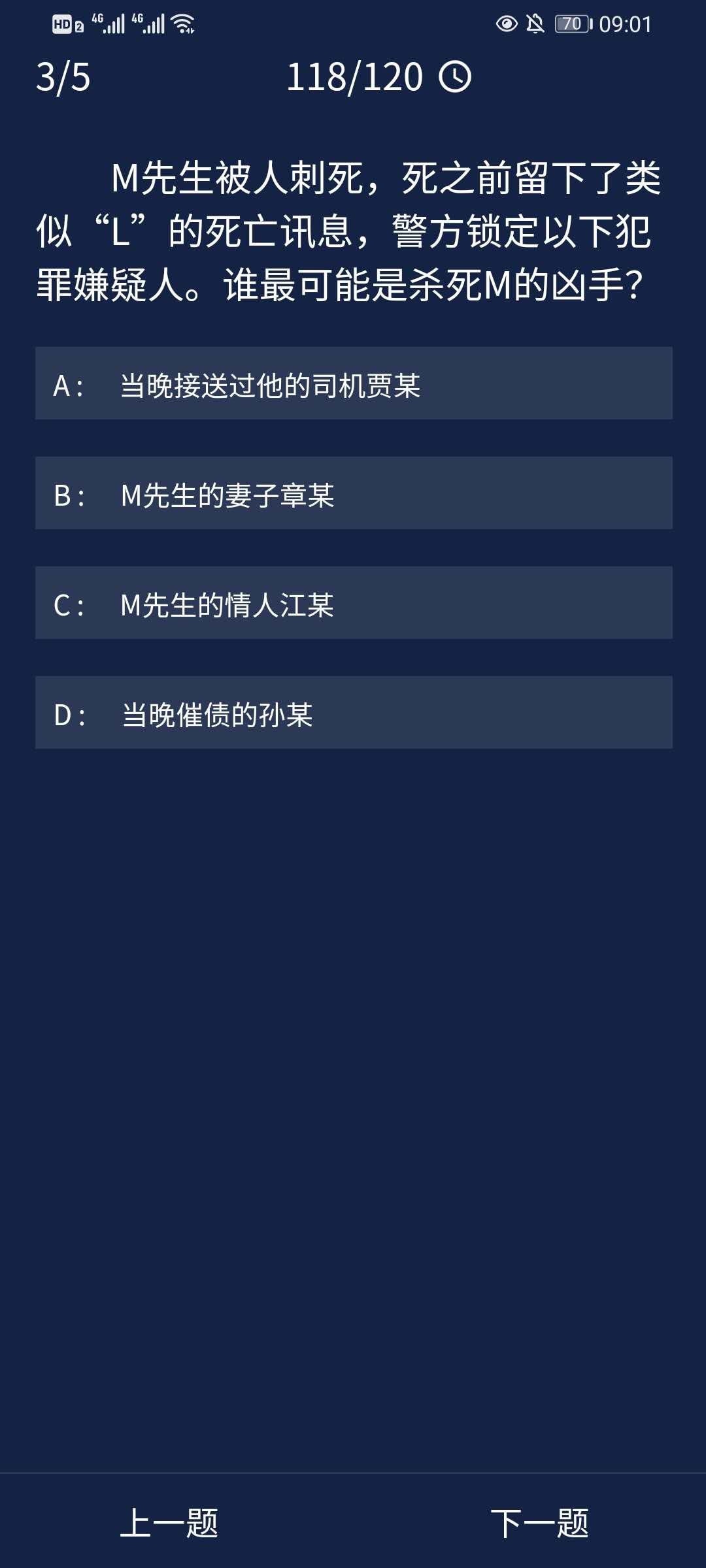 答案解析:M被司机杀害,但是又不知道司机的名字,无奈只能写司机,以职业作为死亡讯息提示,但用尽力气之写了“L”。“L”倒过来看不难发现这是写司机“司”的笔划,所以最可能杀死M的凶手是A。