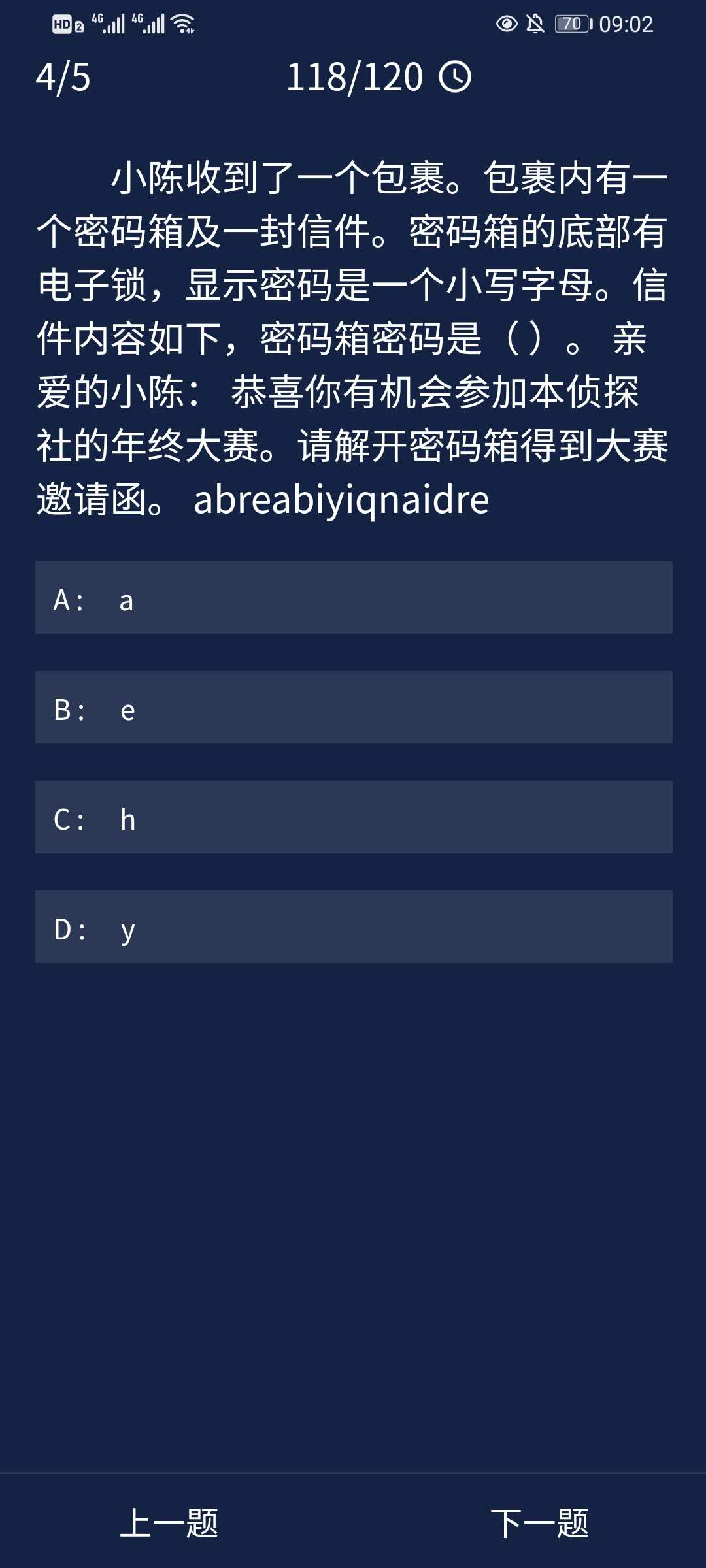 4、小陈收到了一个包裹。包裹内有一个密码箱及一封信件。密码箱的底部有电子锁,显示密码是一个小写字母。信件内容如下,密码箱密码是()。亲爱的小陈:恭喜你有机会参加本侦探社的年终大赛。请解开密码箱得到大赛邀请函。abreabiyiqnaidre