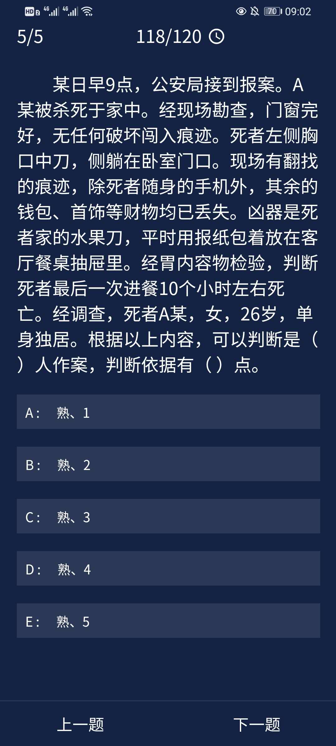 5、某日早9点,公安局接到报案。A某被杀死于家中。经现场勘查,门窗完好,无任何破坏闯入痕迹。死者左侧胸口中刀,侧躺在卧室门口。现场有翻找的痕迹,除死者随身的手机外,其余的钱包、首饰等财物均已丢失。凶器是死者家的水果刀,平时用报纸包着放在客厅餐桌抽屉里。经胃内容物检验,判断死者最后一次进餐10个小时左右死亡。经调查,死者A某,女,26岁,单身独居。根据以上内容,可以判断是()人作案,判断依据有()点。
