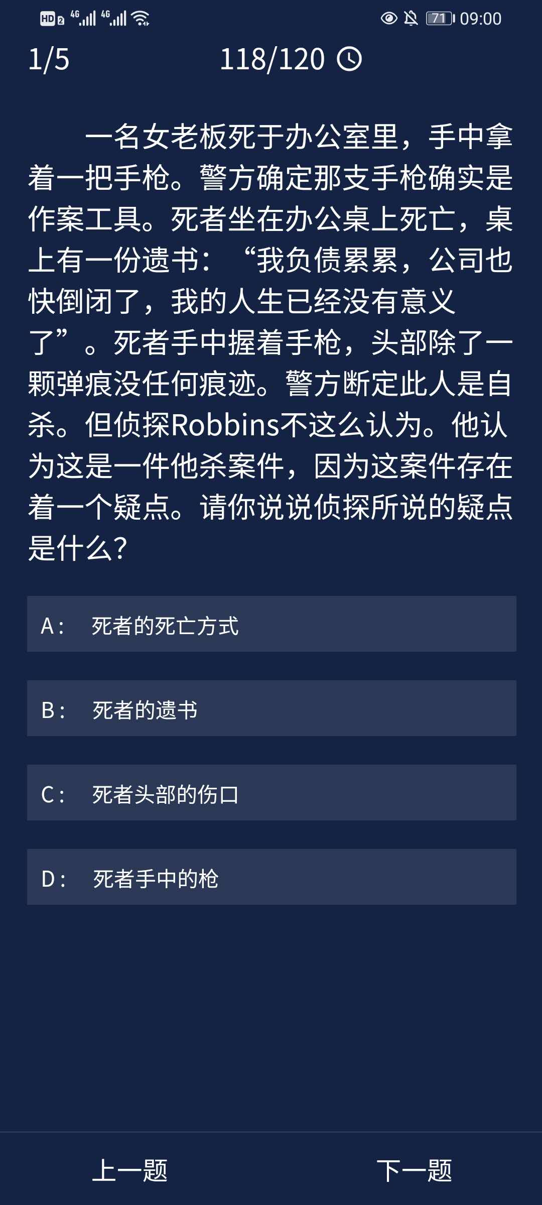 1、一名女老板死于办公室里,手中拿着一把手枪。警方确定那支手枪确实是作案工具。死者坐在办公桌上死亡,桌上有一份遗书:“我负债累累,公司也快倒闭了,我的人生已经没有意义了”。死者手中握着手枪,头部除了一颗弹痕没任何痕迹。警方断定此人是自杀。但侦探Robbins不这么认为。他认为这是一件他杀案件,因为这案件存在着一个疑点。请你说说侦探所说的疑点是什么?