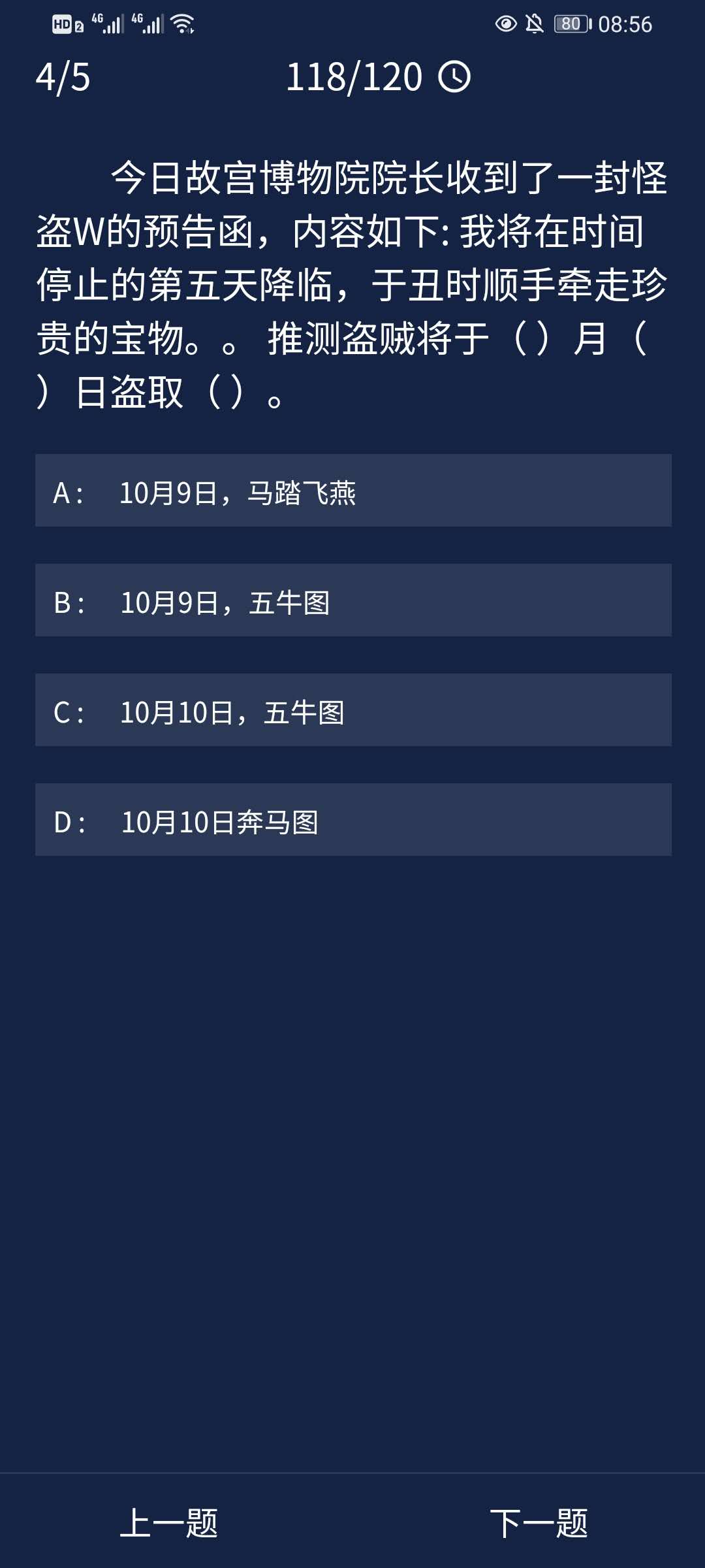 答案解析;时间停止指的是由于历法不完善而被强行抹掉的“1582年10月5日至10月14日”,时间停止的第五天就是10月9日。丑时、牵走表明盗窃目标是《五牛图》。