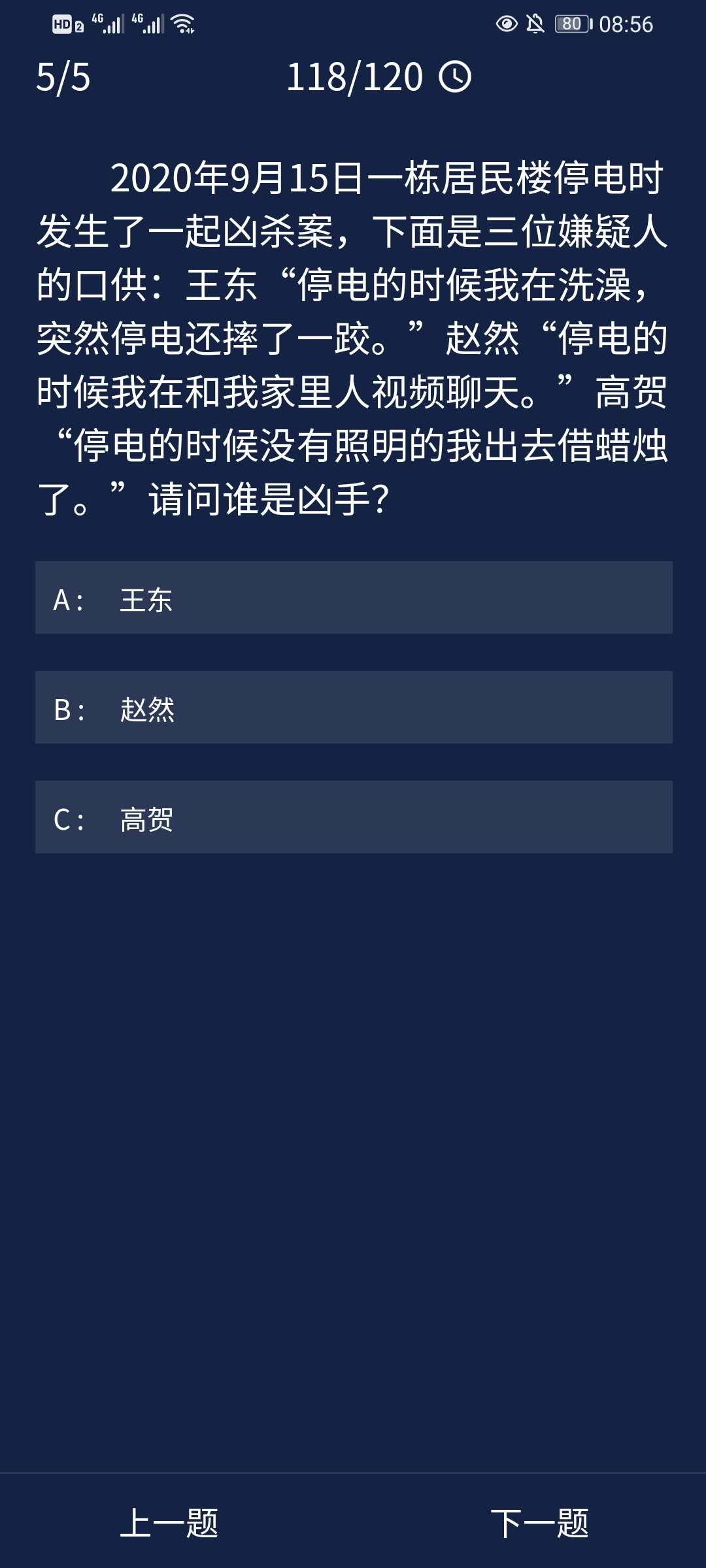 5、2020年9月15日一栋居民楼停电时发生了一起凶杀案,下面是三位嫌疑人的口供:王东“停电的时候我在洗澡,突然停电还摔了一跤。”赵然“停电的时候我在和我家里人视频聊天。”高贺“停电的时候没有照明的我出去借蜡烛了。”请问谁是凶手?