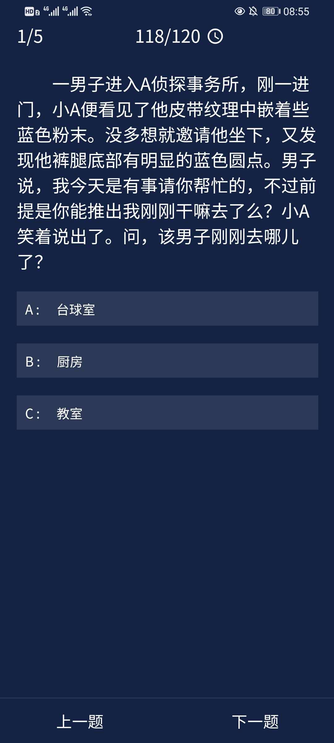 答案解析:蓝色粉末可能为粉笔屑,巧粉...蓝色圆点就几乎肯定了是巧粉。所以,男子应该是刚刚在打台球,而且很可能是个新手。厨师有围裙或厨师服,所以皮带上面不会有蓝粉;教师不会把蓝点弄到裤腿上;打台球的时候要用到防滑粉,而且不会穿专业的服装,粉也会溅到裤腿上。PS:现实中常见的巧粉应该都蓝色或者绿色的。