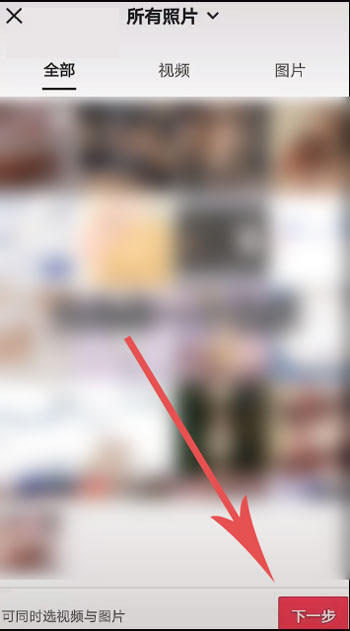 7、以提前拍摄好视频或者图片为例,选择视频或者图片,点击右下角的【下一步】;