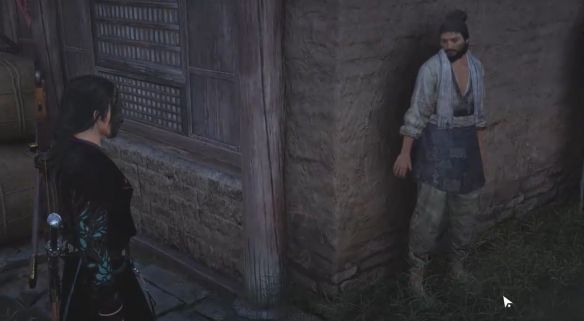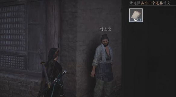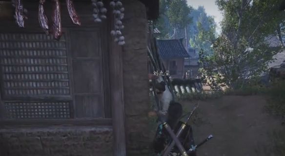 1、我们来到承恩镇下方的传送点,随后向北走,在物资上挂着腊肉和大蒜的房子边上找到刘九蒙。