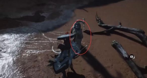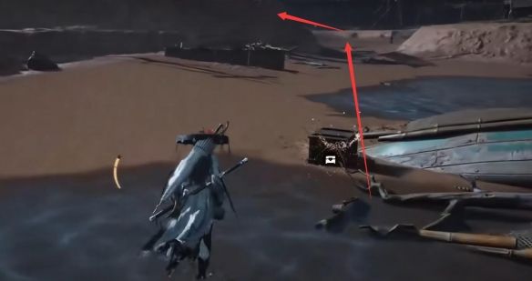 3、回到【万古一人殿】绕到房子的后面,顺着岸边走找到沉船;