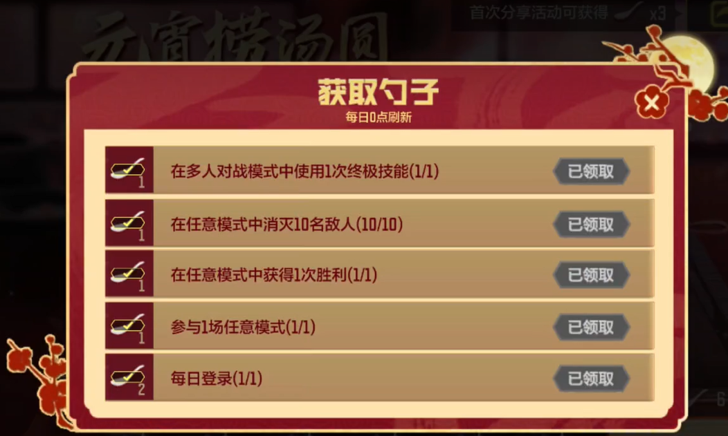 勺子就是你捞汤圆的关键,要获得这个勺子,得完成一些日常任务。具体任务不难,首先是登录游戏,需要玩家们签到。然后是一场对局胜利,这点很简单,打得好就能赢,轻轻松松!接下来是消灭10个敌人。再来是使用一次终极技能,这就得稍微注意下时机。最后是参加任意模式对局,随便选个模式,加入一场就能完成任务。每完成一个任务,就能获得一个捞汤圆的勺子,一天最多可以获得6个。所以,趁着活动时间,抓紧时间完成任务,顺利获得勺子,捞出你心仪的奖励。
