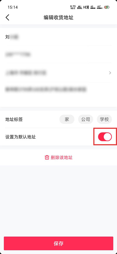5、最后点击【设置为默认地址】右侧的滑块,将其设置为默认收货地址,点击【保存】即可;
