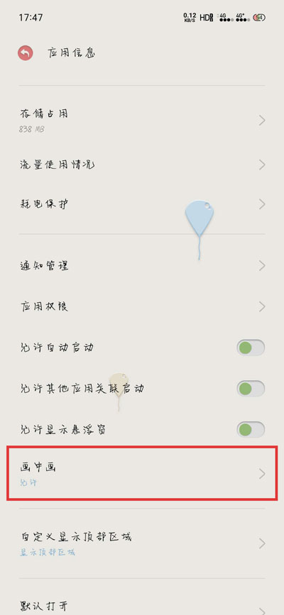 2、进入应用信息页面后,下滑找到【画中画】功能;