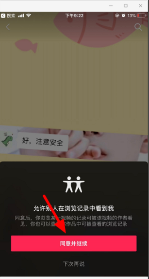 4、在提示的“允许别人在浏览记录中看到我”,点击【同意并继续】;