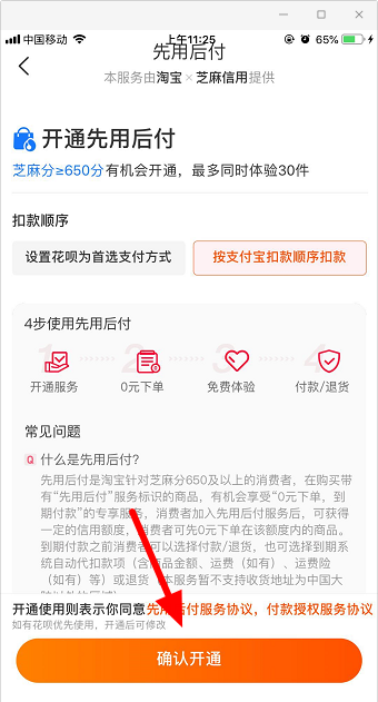6、选择【确认开通】按钮,开通先用后付;