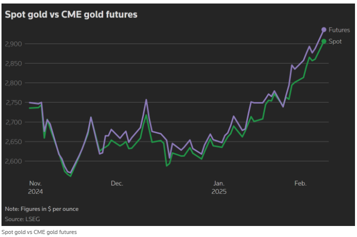 对关税计划的担忧在COMEX黄金期货中得以反映,COMEX黄金期货主要合约的交易价格高于现货价格,目前溢价达到约为28美元。