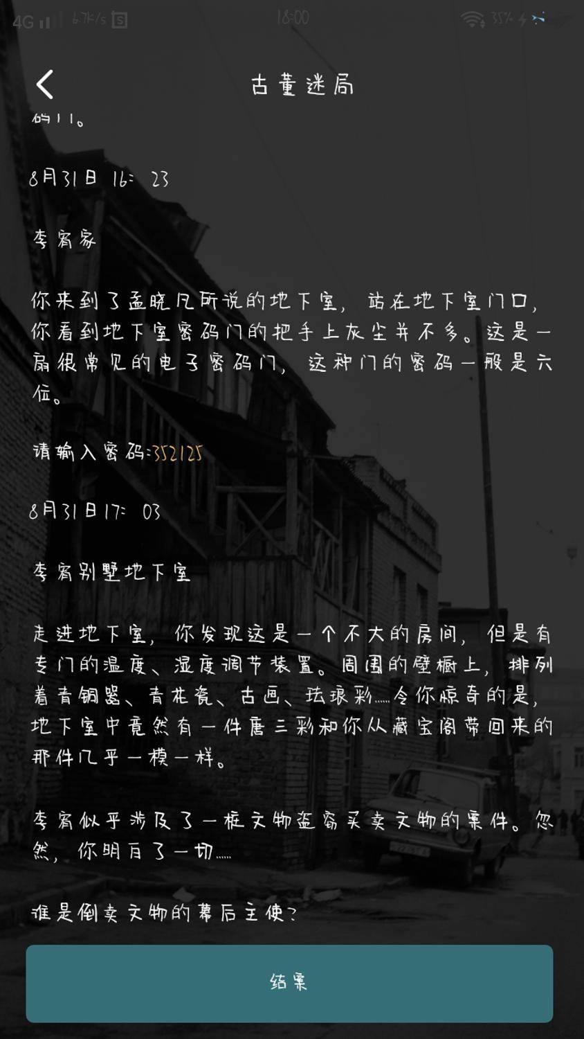六、在输入完密码后会随着剧情推动接着出现两个题目,1、谁是贩卖文物的人;2谁是杀死李侑的人;这个就需要各位玩家自己寻找线索了,由于第三关还没关闭所以答案也是没有确定的。