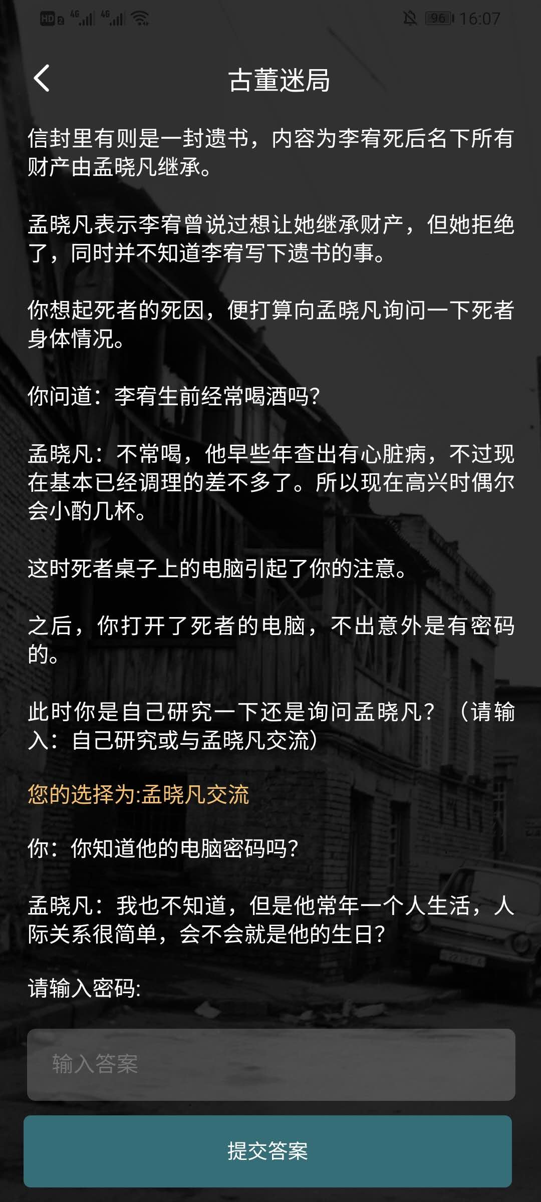 三、在点击完与孟晓凡交流后,系统就会根据剧情出现提示,需要自己破译密码了。