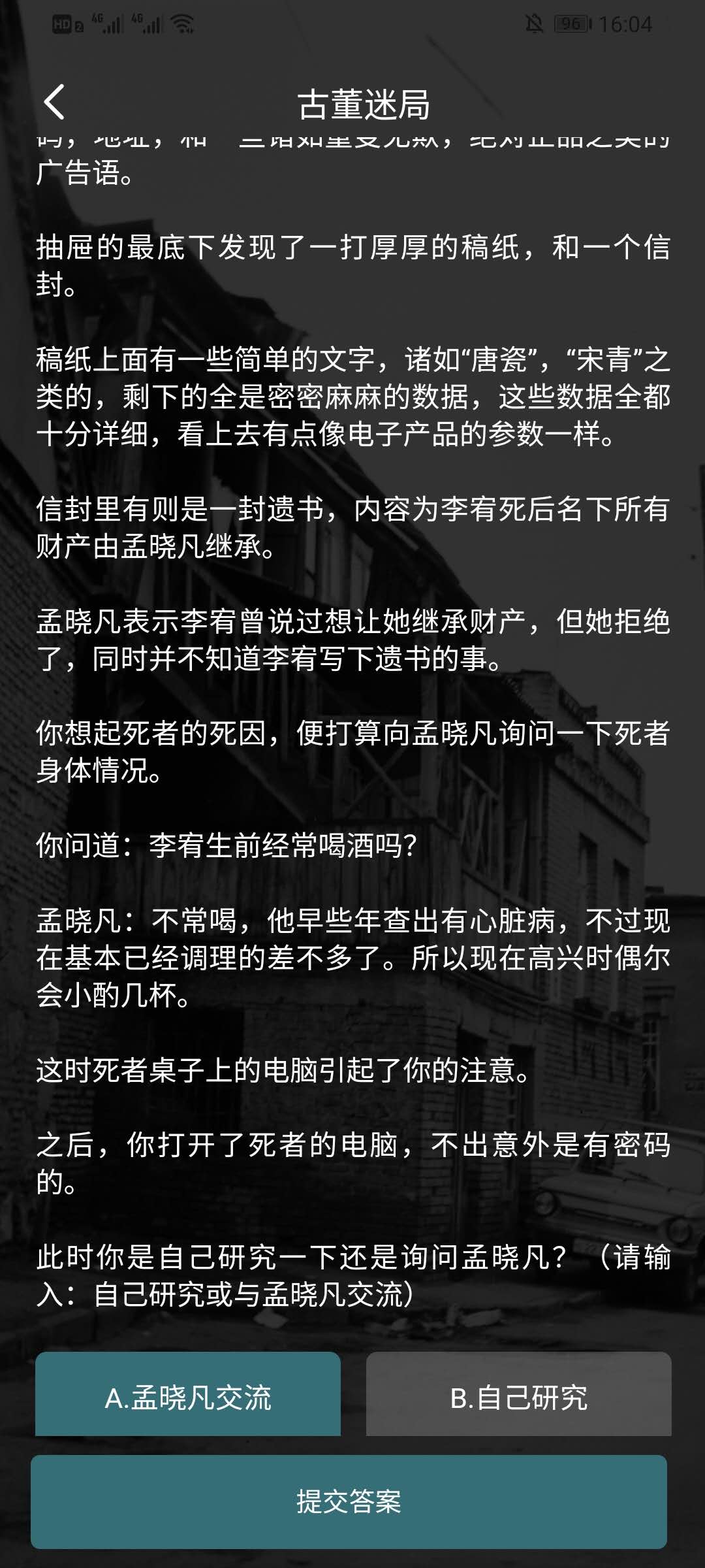 一、小编选的答案是“A”,第一个选择中只有两个选项,都可以推动剧情(也就是说选什么都可以推动剧情,前期选错后期可能还会有可能选择正确)。选择答案后点击提交,剧情继续。