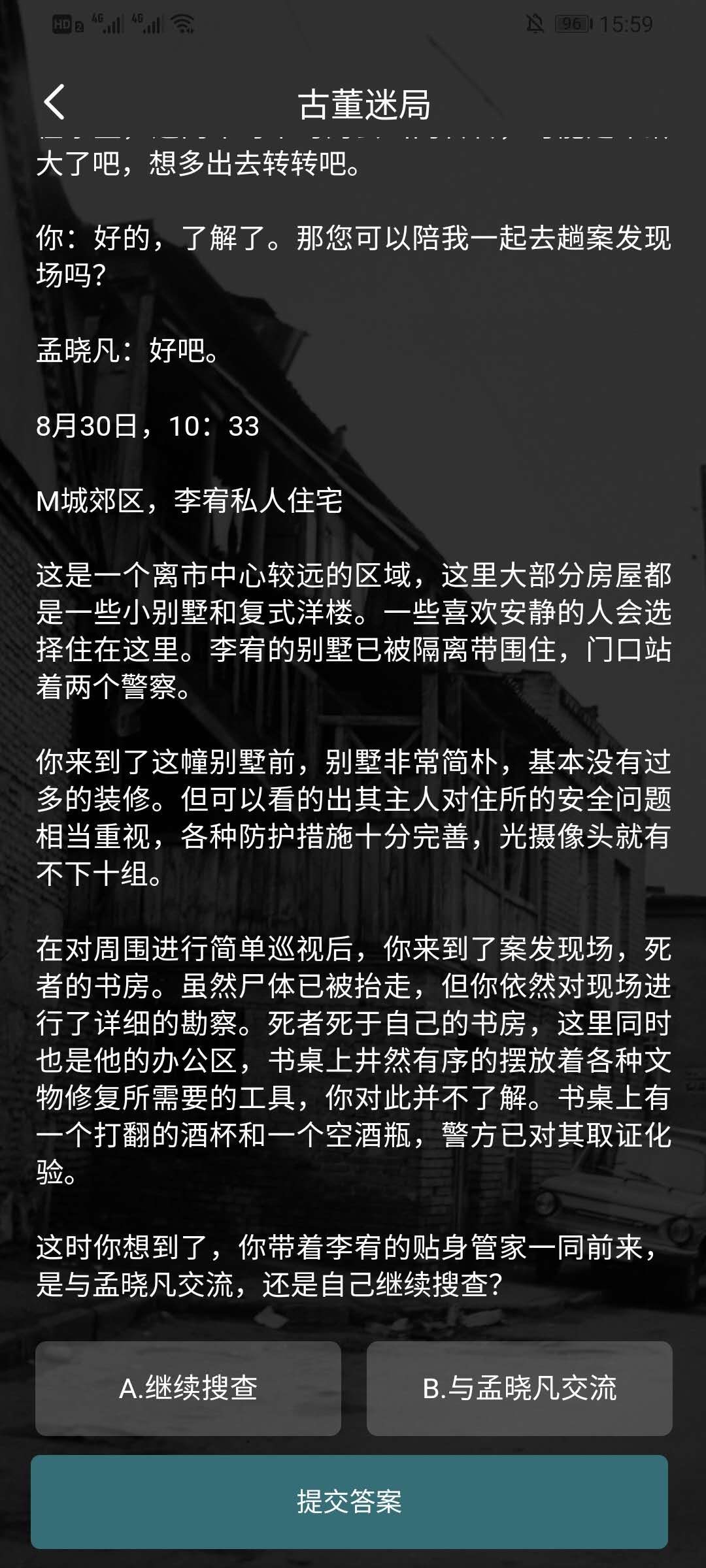 玩家可以根据自己对上面剧情的阅读,进行判断,是选择继续搜查还是与管家交流(小编选的是A:继续搜查)。在跳出的剧情中玩家可以根据两段剧情判断选择的答案。
