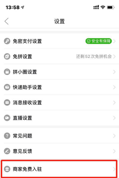 3、接着在设置中点击最下方的【商家免费入驻】一项;
