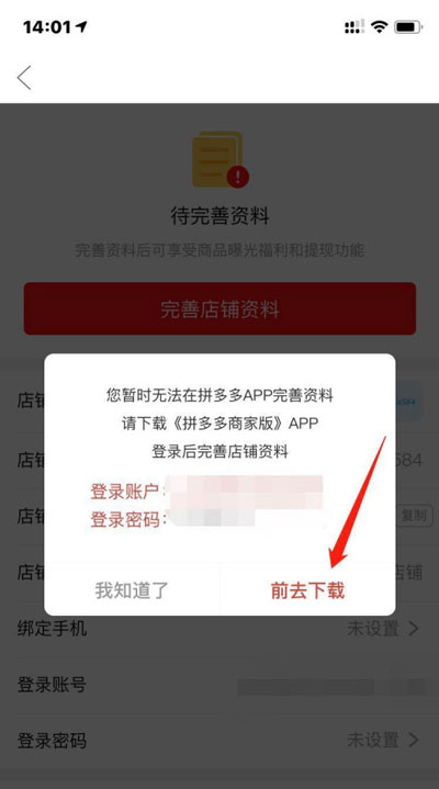 6、因为拼多多APP无法完善资料,需要使用给出的账号和密码,点击【前去下载】下载拼多多商家版,才可以完善,完善后就可以在拼多多内售卖物品了;