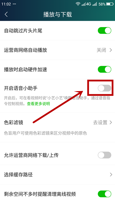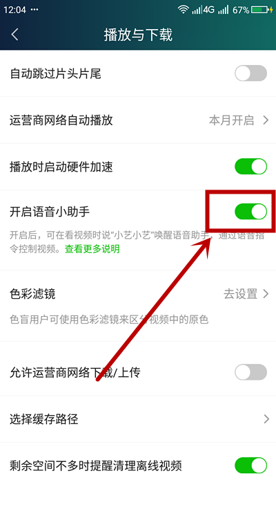 4、最后在播放与下载设置中,开启【开启语音小助手】右侧的滑块,即可打开语音小助手功能;