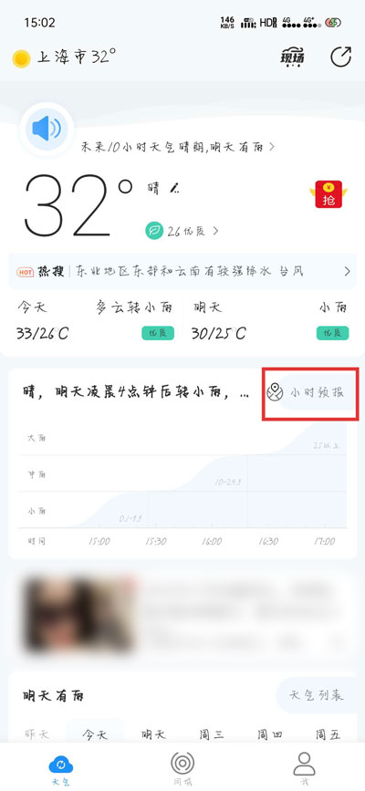 4、之后可以点击【小时预报】切换查看温度、风度;