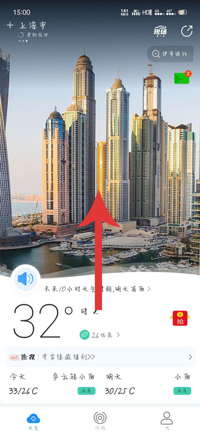 2、打开手机中的最美天气APP,在打开并定位到需要查看天气的位置,下滑;