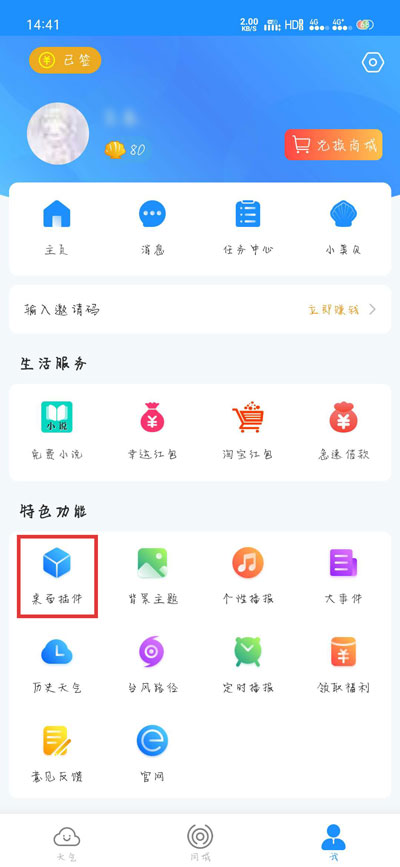 2、然后在下方的特色功能中点击【桌面插件】功能;